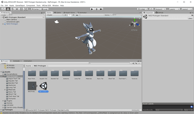 Now you want to go into the extracted files from NKD_Protogen.rar and open the "NKD Protogen Unity Pack.unitypackage" file. Unity will show the import menu. Import everything in it.