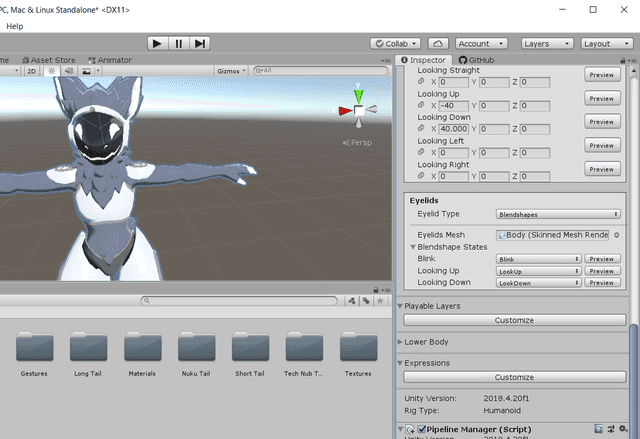 The .asset files are used to create the Expressions menu for the avatar. You can click on these files in the Project view at the bottom of Unity to view them in the Inspector on the right. You may remember that we set "Main Menu.asset" and "Main Menu Parameters.asset" to be used by the avatar. "Main Menu Parameters.asset" specifies parameters that the expressions menu is able to control. Specifying a parameter in this file allows it to be configured by the menus. These parameters are then acted on by the FX.controller which we'll see later.