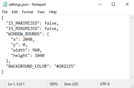 "DANGEROUS_ENABLE_DEVTOOLS_ONLY_ENABLE_IF_YOU_KNOW_WHAT_YOURE_DOING": true,The settings file should now resemble the following. Don't worry if the rest of your settings file looks different than this.